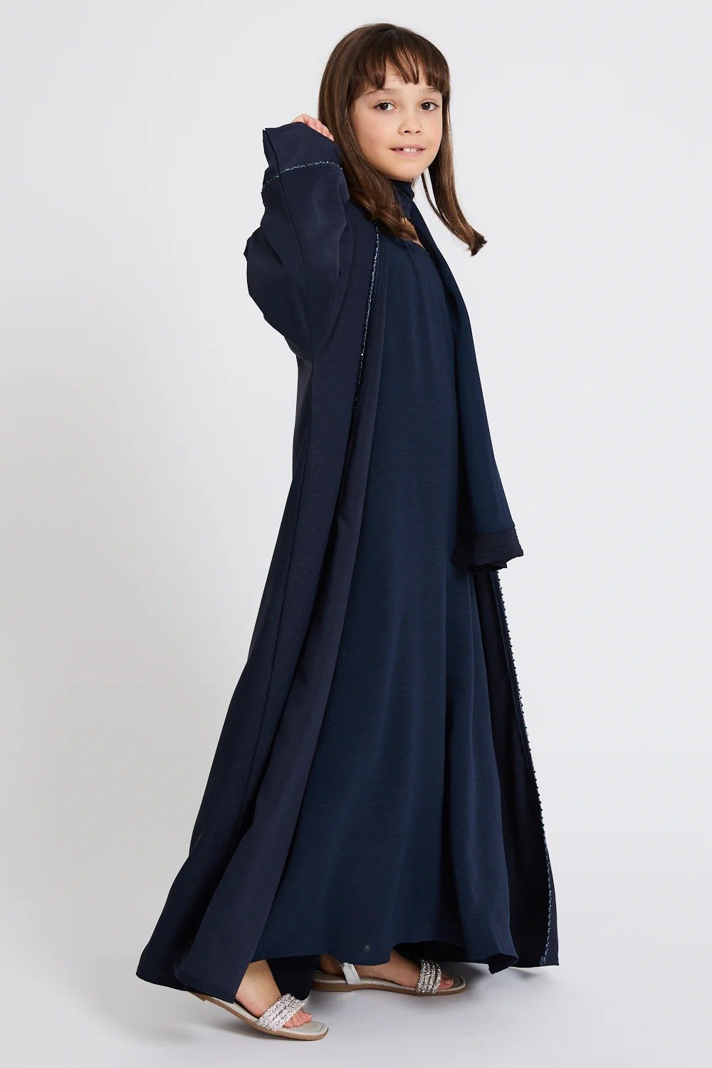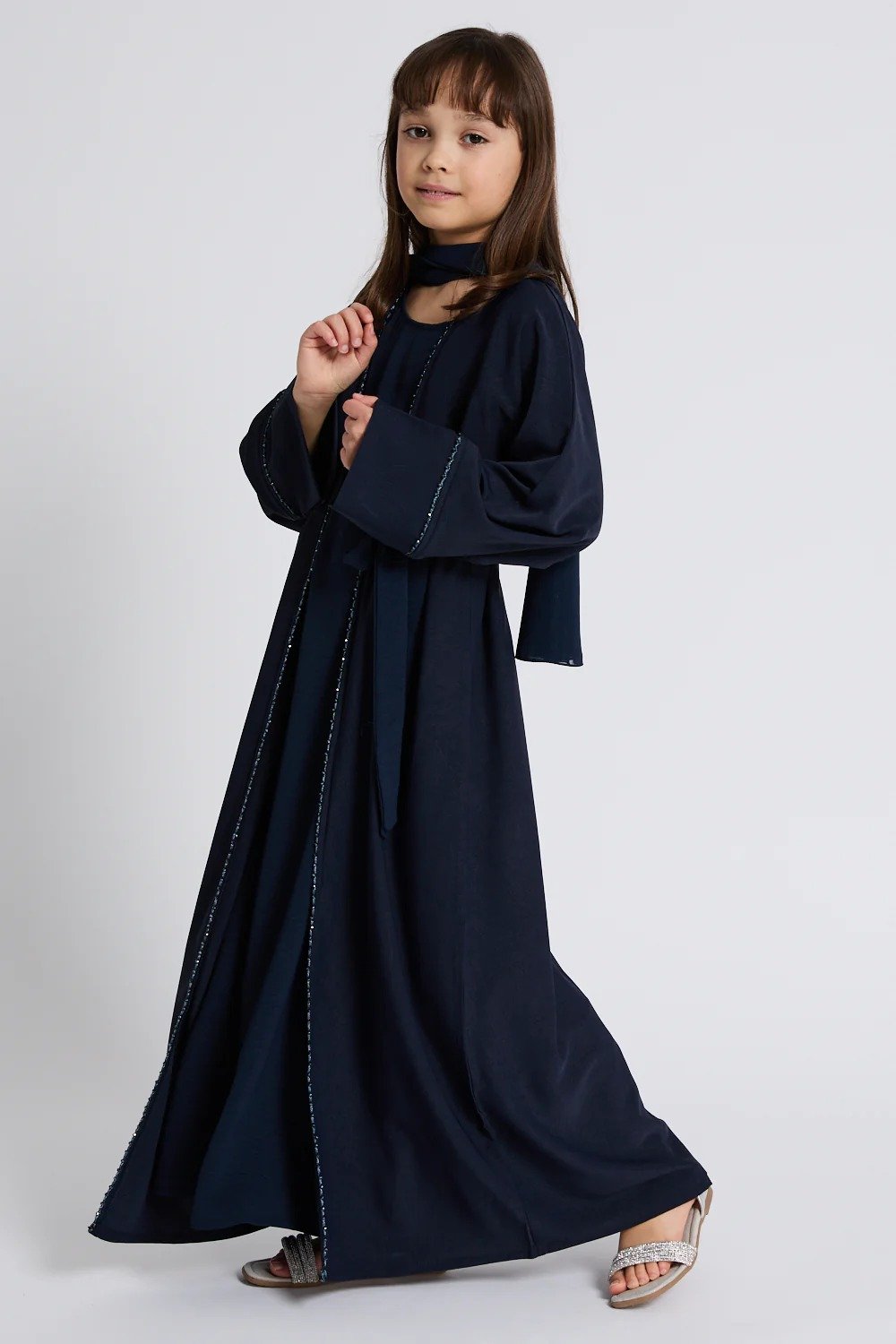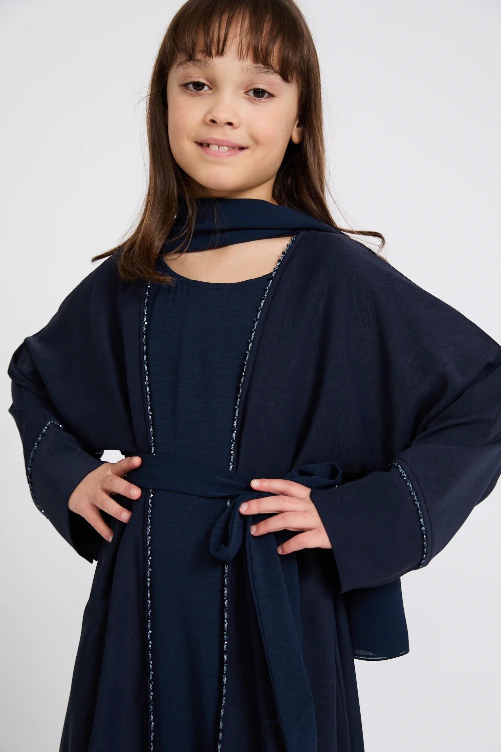 The Navy Blue Kids Embellished Nida Abaya Set from GUZELIC is designed to bring out effortless charm and sophistication for young girls.