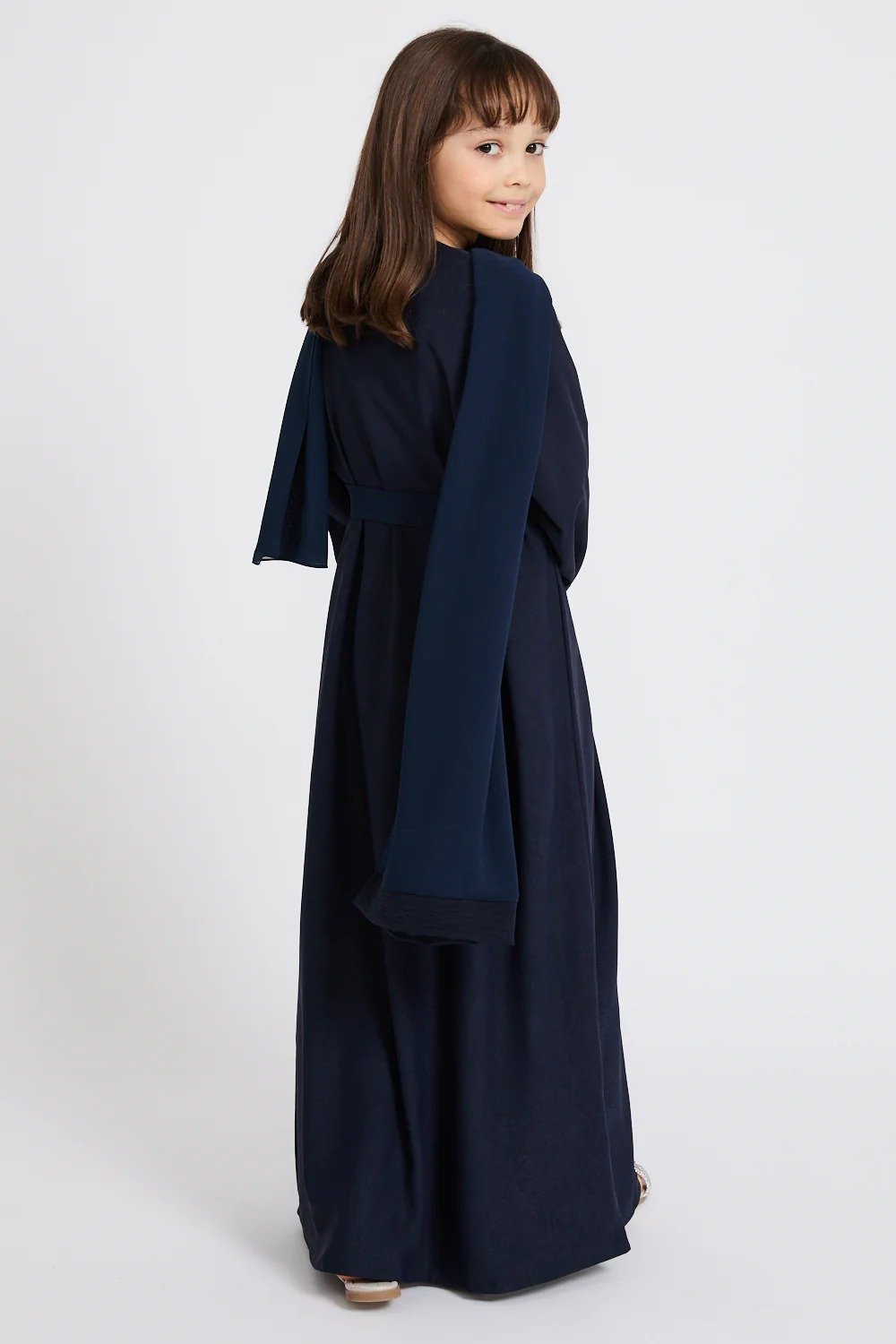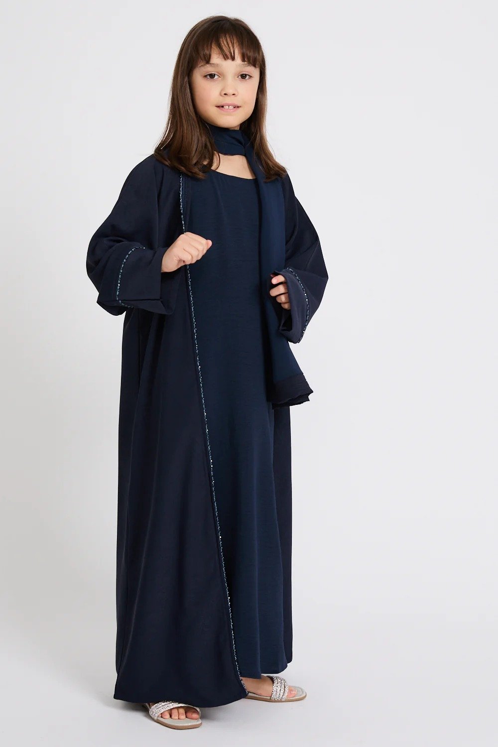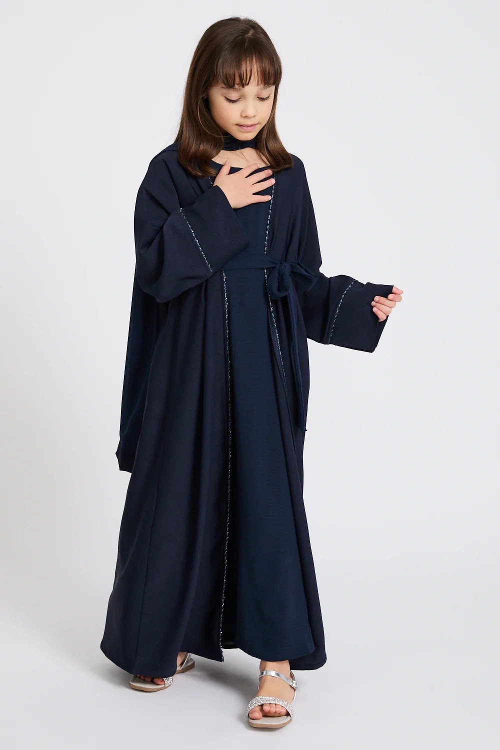 The Navy Blue Kids Embellished Nida Abaya Set from GUZELIC is designed to bring out effortless charm and sophistication for young girls.