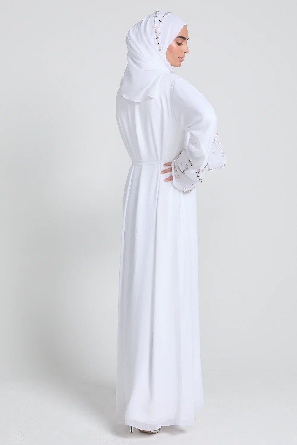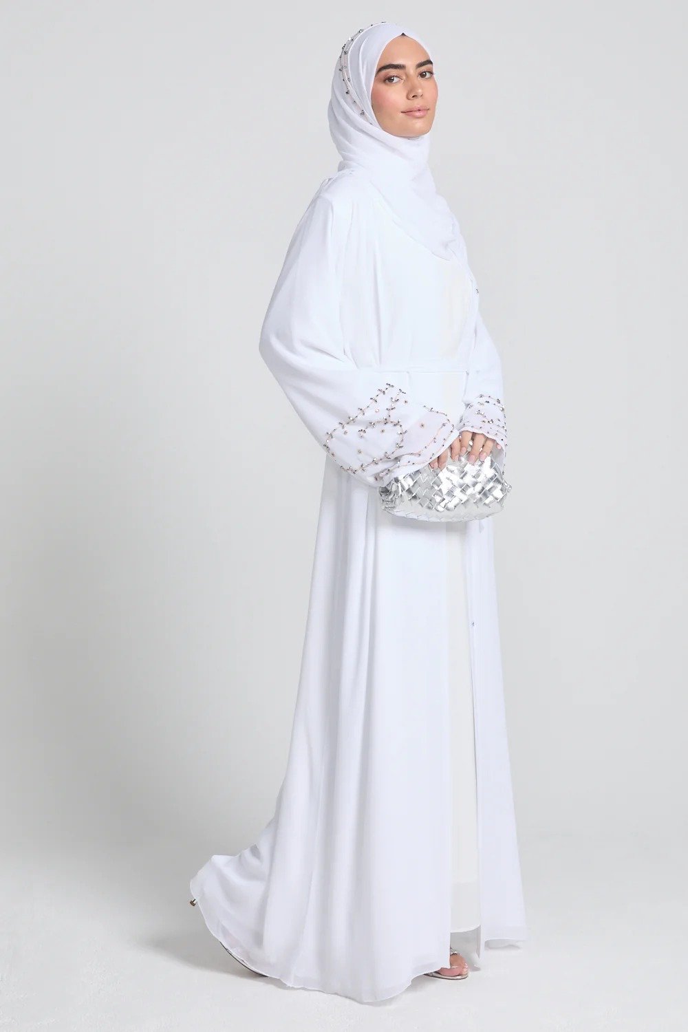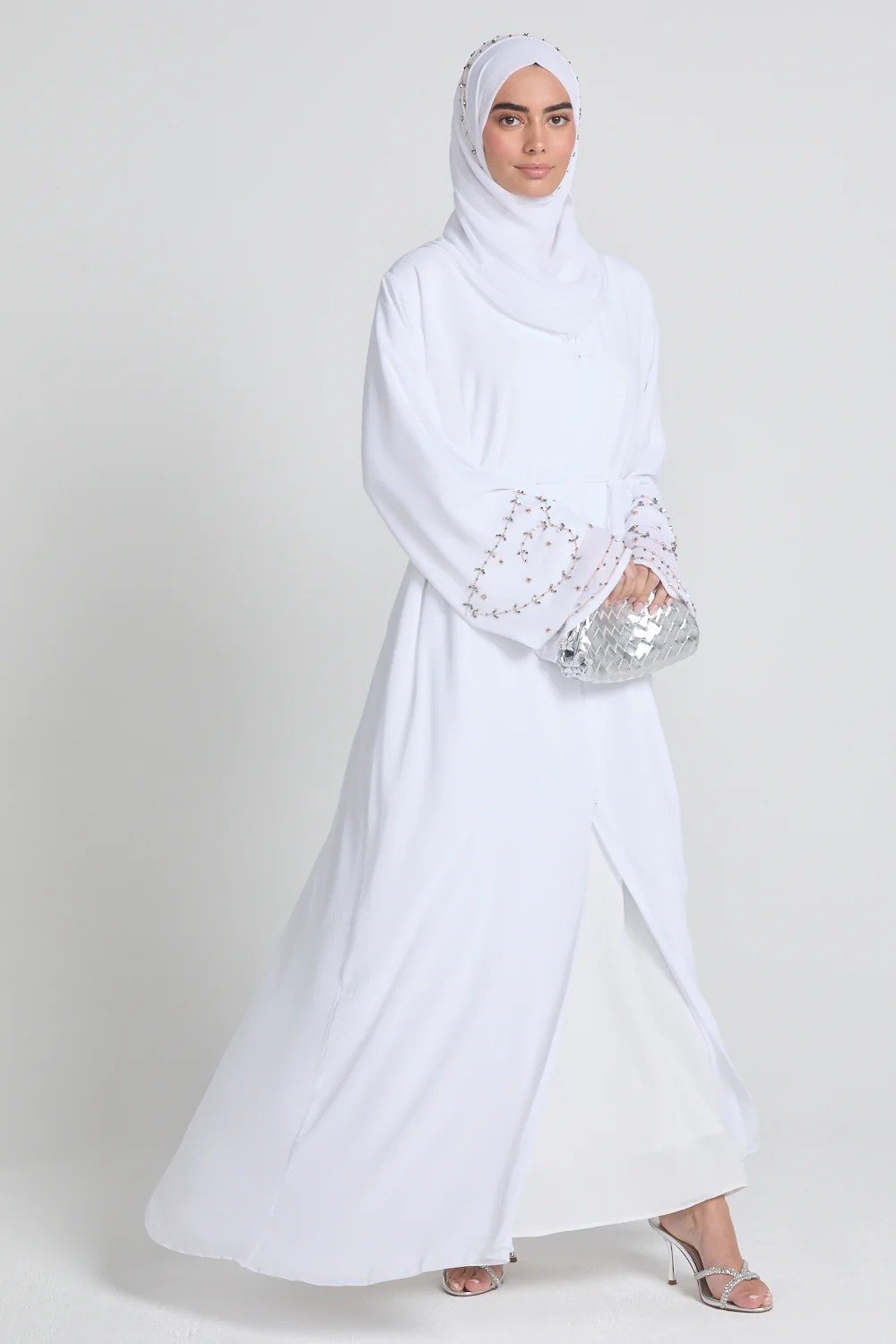 The White Embellished Nida Open Abaya Set from GUZELIC is a masterpiece of timeless sophistication and refined modesty.