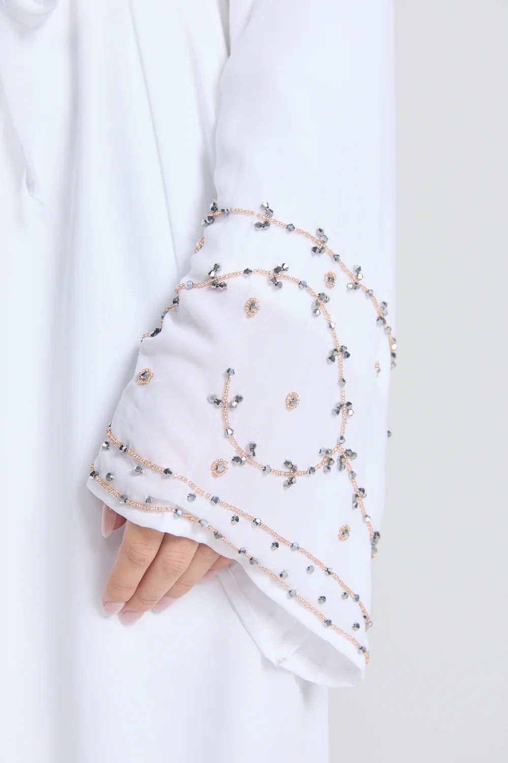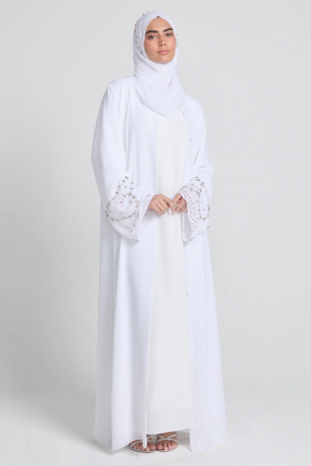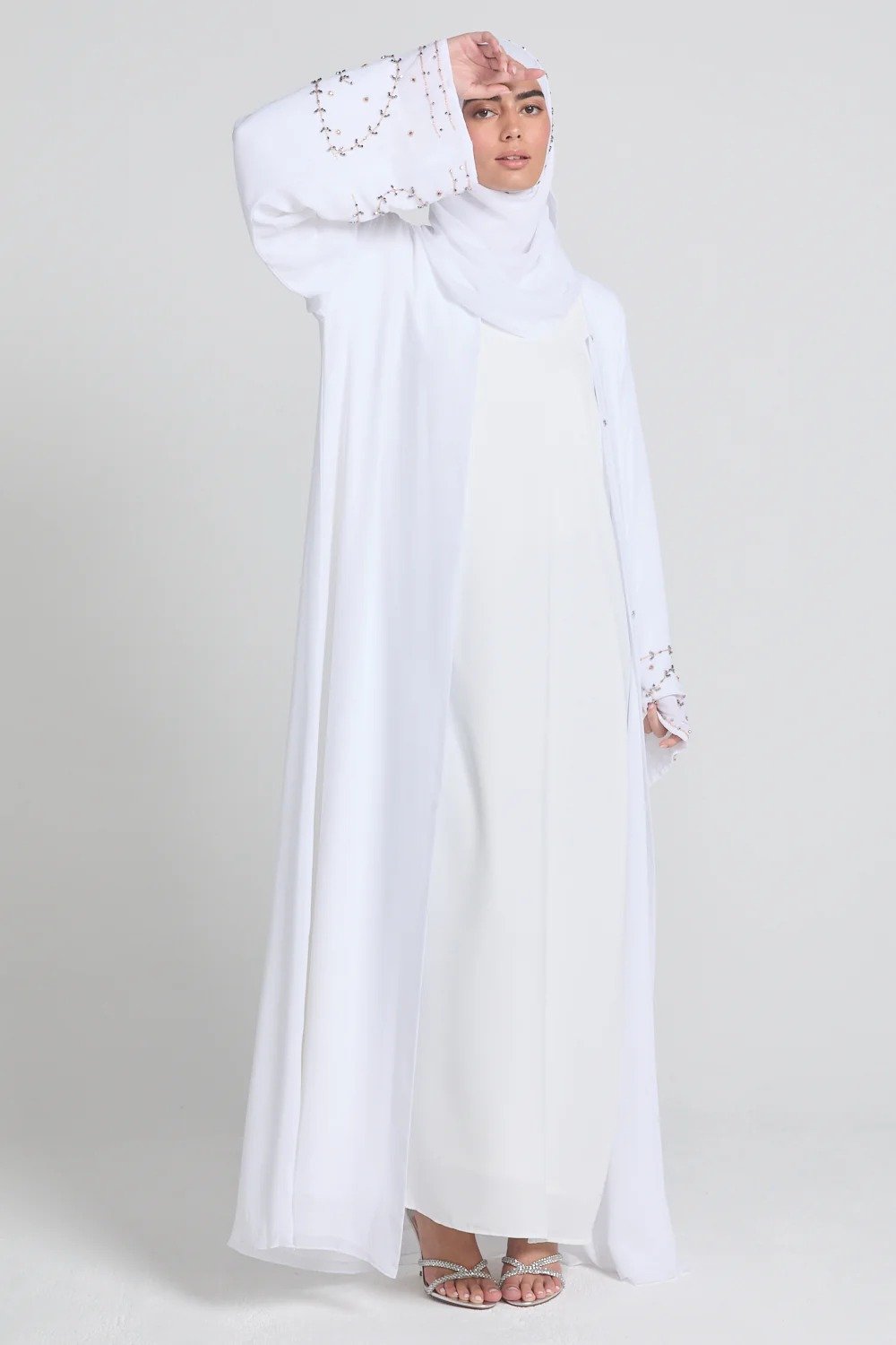 The White Embellished Nida Open Abaya Set from GUZELIC is a masterpiece of timeless sophistication and refined modesty.